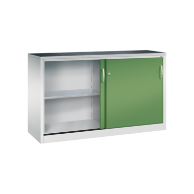 Stahl-Schiebetürenschrank Acurado. Türen mit Leichtlaufrollen in spezieller Schienenführung. Zentralverschluss mit Wechselzylinder. Innen Mitteltrennwand. Ergonomische Design-Griffe. Achtung: Anlieferungsmöglichkeit durch Sattelschlepper muss gegeben sein.